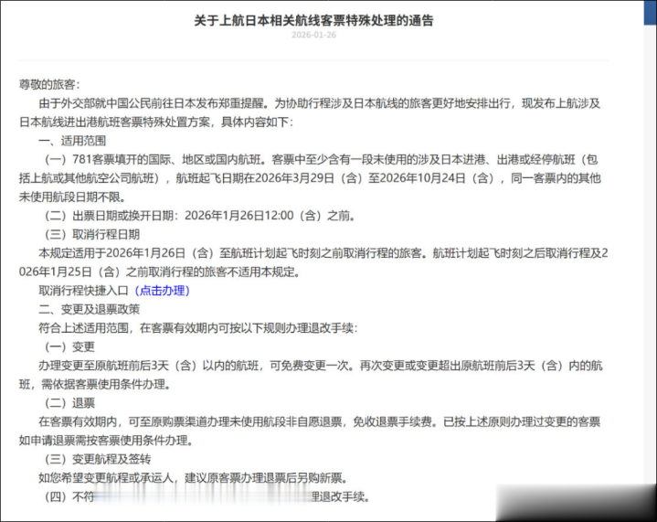 据悉,2025年10月26日至2026年3月28日为2025/26冬春航季。2026年3月29日至2026年10月24日为2026/27夏秋航季。此次集体公告,意味着日本航线免费退改签政策延长至今年夏秋航季。