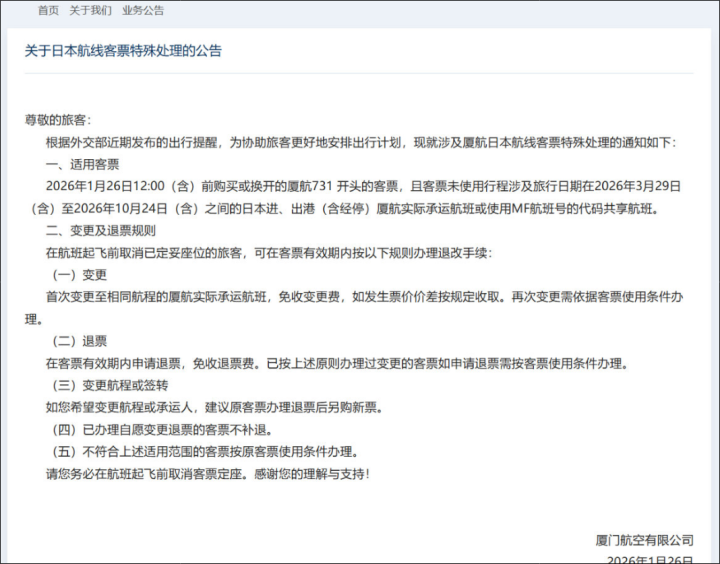 国航、东航、南航、厦航今天下午陆续发布通知称,1月26日前出票,航班起飞日期在2026年3月29日(含)至2026年10月24日(含)的日本进出港或经停航班,可免费退改签。公告均指出,根据外交部发布的出行提醒,为协助受影响旅客更好地安排出行伯乐配资,现发布涉及日本航线进出港航班客票特殊处置方案。